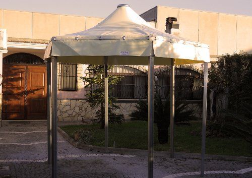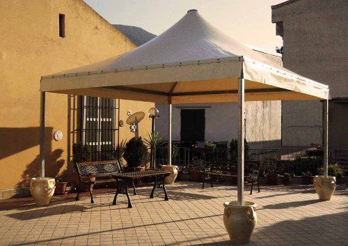 Struttura quadra o rettangolare interamente in acciaio zincato, con copertura in PVC. Senza tralasciare il suo design, offre la possibilità di essere montata e smontata in brevissimo tempo, senza l'aiuto di attrezzature professionali.. Grazie alla sua struttura con pilastri quadri, è l'ideale per la chiusura totale della struttura con teli in PVC e tende scorrevoli.