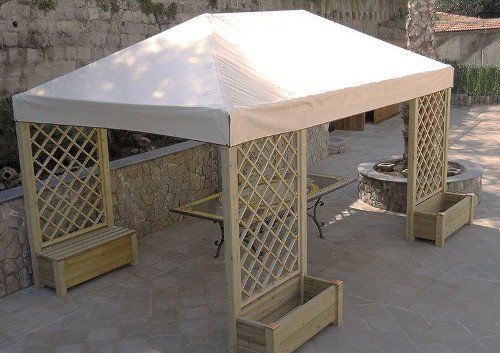 Il gazebo modello SAHARA ha una struttura elegante e versatile in legno. Esso è di varie dimensioni e forme rettangolari, per adattarsi ad ogni spazio, ed è dotato di un’elegante copertura in PVC molto resistente, per garantirgli lunga durata all’aria aperta. La struttura è in legno di pino lamellare impregnato in autoclave, secondo la normativa vigente ed è composta da perimetrali, arcarecci e pilastri. L’impregnazione sottovuoto è a pressione in autoclave, per conferire al legno proprietà antitermiche, antitarlo, antimuffa e antimarcescenza secondo determinati parametri e controlli. I trattamenti sono effettuati nel massimo rispetto dei parametri ecologici, ed i controlli eseguiti garantiscono l’efficacia degli stessi.